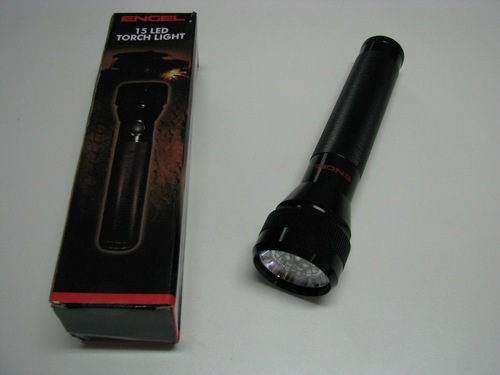 Item number: EDTORCH Engel 15 LED Torch Light. Features: * A powerful, Solid, Durable & Waterproof Design Intended for Rugged Outdoor Use * Ultra Bright LED - 15 bulbs * Produces an Amazing Brightness During Battery Lifetime * Easy Grip Body Specifications: * Aluminium Body with Anodised Finish * Size: 22.7cm x 5.7cm x 3.8cm * Weight: 265 grams * Uses 2 x "D" Cell Batteries (not included) Price: | |